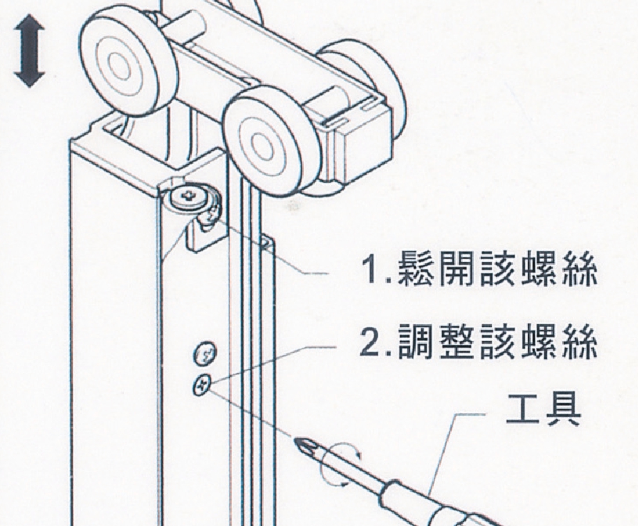 吊輪組預設±3mm的微調位置,輕鬆調整門扇高度,保持門扇間的平衡。 -