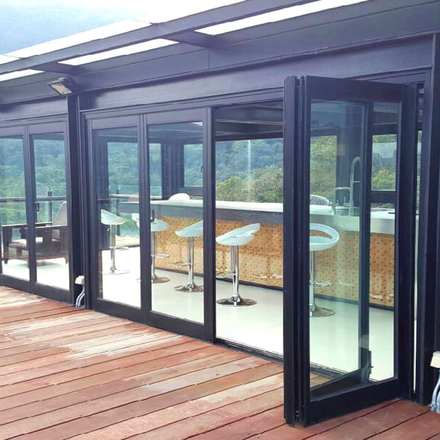 引領時尚潮流,顛覆傳統鋁門窗設計概念,使光照與動線都能夠自由穿梭,為窗前美景打開無限 的視野 ,提供100%的開啟空間,使室內更寬敞,讓您的視野與機能延伸,陽光與美景一同引入 室內,享受全然不同的觀感,創造更令人心曠神怡的氛圍。 產 品 性 能 實 驗(依據CNS3092-A2044標準) ■ 水密度 : 50 kgr/m2 ■ 氣密度 : 2~8m3/hm2 ■ 強 度 : 240~360gf/m2 (上述三項皆會依據尺寸大小增減) ■ 鉸鏈設計: 公母穿梭隱藏式鉸鏈、收邊料無螺絲 ■ 膠條設計:窗框(門)邊設有6條矽膠條、防水效果好耐高 溫150° ■ 軌道省力設計: 上懸吊式每折8只導輪開閉省力 ■ 把手設計: 180°平移旋轉連動設計故障率低 ■ 導輪材質: 防塵包覆式高鉻鋼珠培林 ■ 門窗設計: 門開方向為外推式,雙扇設計可自由活動、左 右移動也可以一邊手動固定 ■ 外框: 8cm ■ 玻璃: ※單層玻璃溝槽可裝 8mm以下厚度玻璃 ※複層玻璃溝槽可裝 20mm以下厚度玻璃 ※複層玻璃內藏百葉 *備註:水密性試驗在持續噴水下,依CNS 11528之規定,施加10分鐘脈動壓,皆無CNS規定之漏水情形。 適用範圍: 飯店、餐廳、咖啡店、景觀豪宅、民宿、室內室外開放式空間、面對庭園的區域、或是大型的一樓店面...等)-