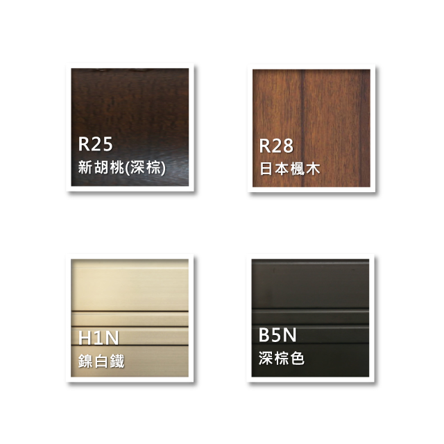 ※木紋系列 – 採用真空木紋轉印,以高溫220℃狀態真貼合壓力,使轉印油墨滲透入塗膜內層,滲入深度30μm,能有效與塗料結合,使木紋紋路更清晰持久,可耐紫外線UV照射,高耐候等級塗料符合美國 AAMA2605 & AAMA0604 耐候規範。顏色:H1N、B5N、R25、R28