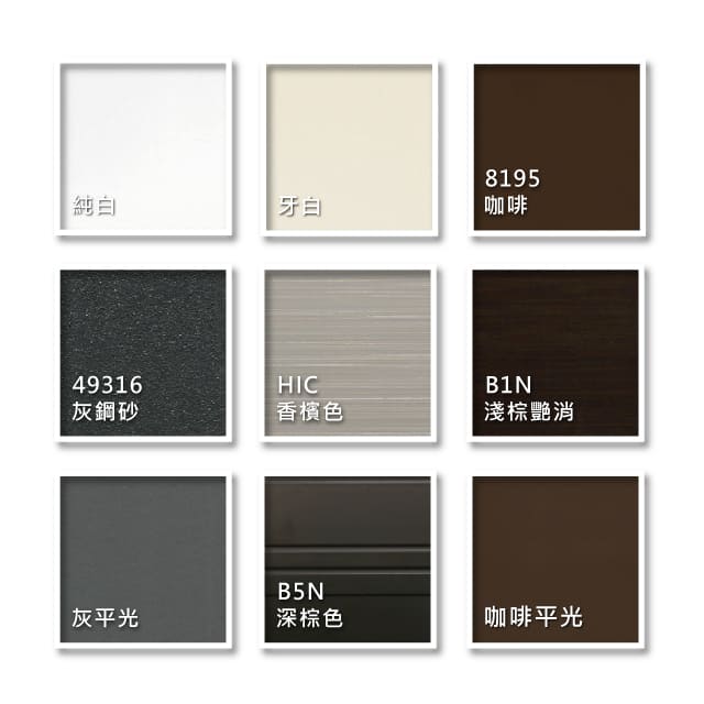 ※木紋系列 – 採用真空木紋轉印,以高溫220℃狀態真貼合壓力,使轉印油墨滲透入塗膜內層,滲入深度30μm,能有效與塗料結合,使木紋紋路更清晰持久,可耐紫外線UV照射,高耐候等級塗料符合美國 AAMA2605 & AAMA0604 耐候規範。顏色:純白、牙白、8195、49316、香檳、 B1N、灰平光、B5N、咖啡平光 適用於加壓門