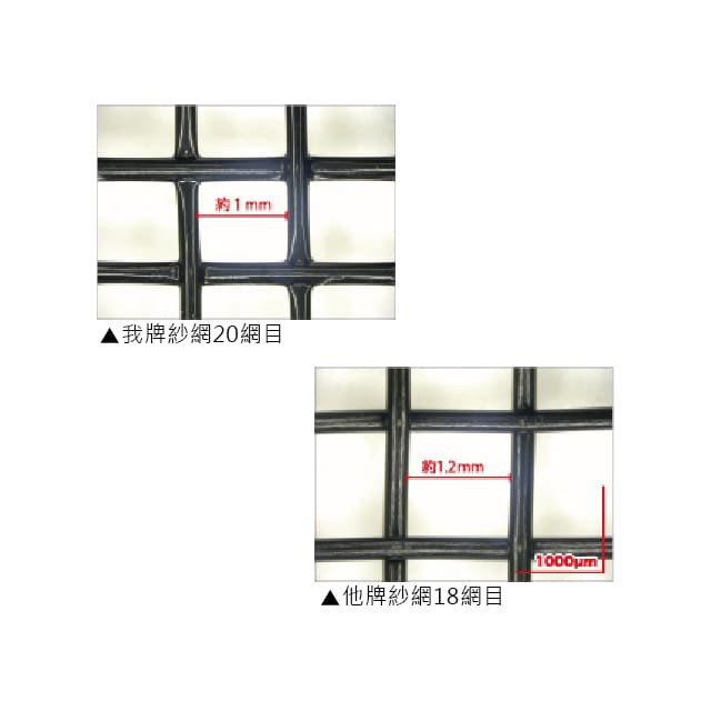 一般紗門採用18網目,本紗網採用20網目,更細更能防止蚊蟲入侵。 -