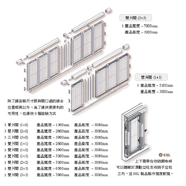 ●本款紗門具超高大開口特性,最大寬度為 7800mm,最大高度為 3000mm。