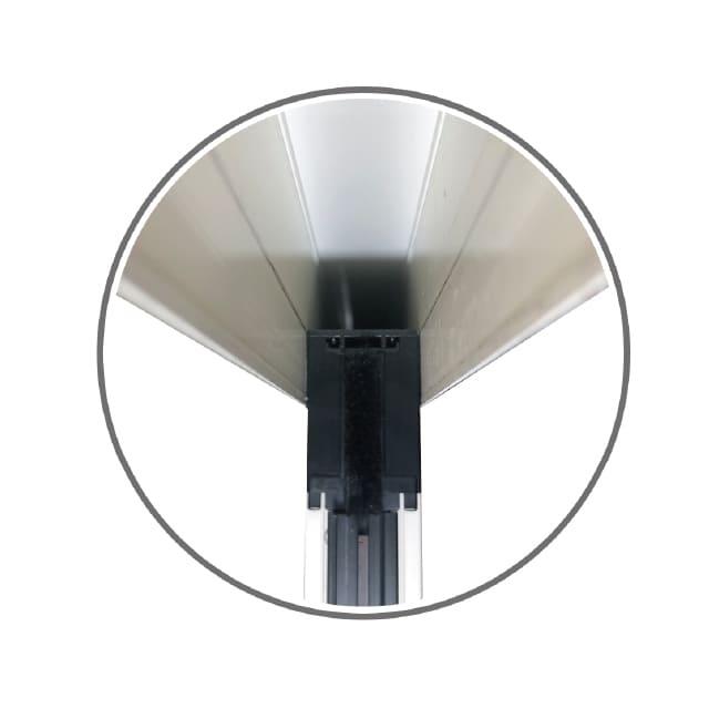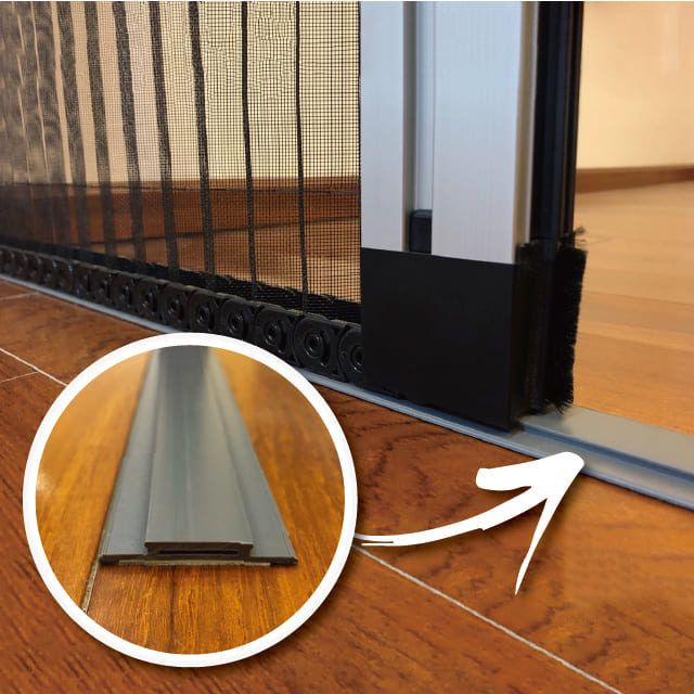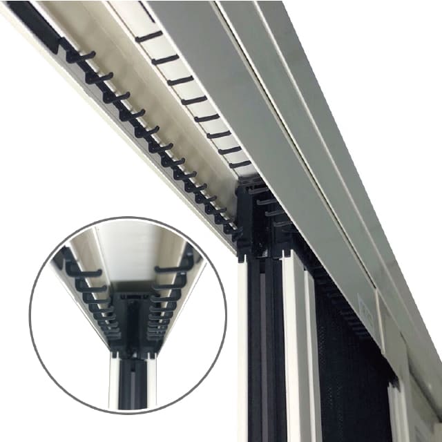為落實居家安全,多連結紗門有獨家的防脫落上導軌,若紗門因受外力撞擊而脫軌時,上導軌會勾住紗門本體防止脫落。(紗門高度高於2400mm或風大地區建議採用多連結款式-防脫落上導軌) -